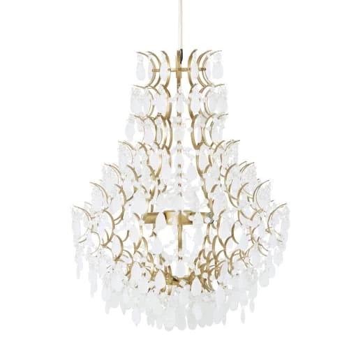 On parie que votre cœur va s’emballer à la vue de la suspension à pampilles en verre opaline et métal doré BROADWAY. Vous ne résisterez pas longtemps au charme de ses pampilles en verre opaline, délicates et raffinées. Une fois allumée, cette suspension vous fascinera par son allure de nuage lumineux plein de poésie. Romantique à souhait, il offrira beaucoup d’élégance à un salon ou un séjour au style classique. Donnez-lui encore plus de douceur avec une banquette capitonnée en velours et une jolie console aux pieds galbés. Qu’en dites-vous ?