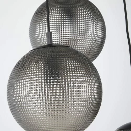 Le style contemporain s’invite chez vous avec la suspension triple en verre fumé irisé et métal noir CHATILLON. Avec trois abat-jours boules en verre soufflé tombant à hauteurs différentes, cette lampe à suspendre
